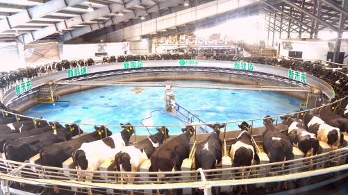 奶牛在重型转盘挤奶机上挤奶。本报融媒体记者 邢栋 摄
